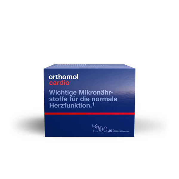 Orthomol Cardio ist ein Nahrungsergänzungsmittel. Wichtige Mikronährstoffe für die normale Herzfunktion. Mit den Omega-3-Fettsäuren EPA und DHA sowie Vitamin B1 (Thiamin) als Beitrag zu einer normalen Herzfunktion.
