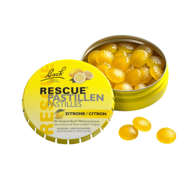 Süßungsmittel (Sorbit, Maltit, Isomalt, Xylit), Geliermittel (Gummi Arabicum), Säuerungsmittel (Zitronensäure), natürliches Aroma (Zitrone), Farbstoff (Kurkumin), Palmkernöl, Überzugsmittel (Bienenwachs), Bach®-Blütenessenzen RESCUE® (Helianthemum nummularium, Clematis vitalba, Impatiens glandulifera, Prunus cerasifera, Ornithogalum umbellatum).